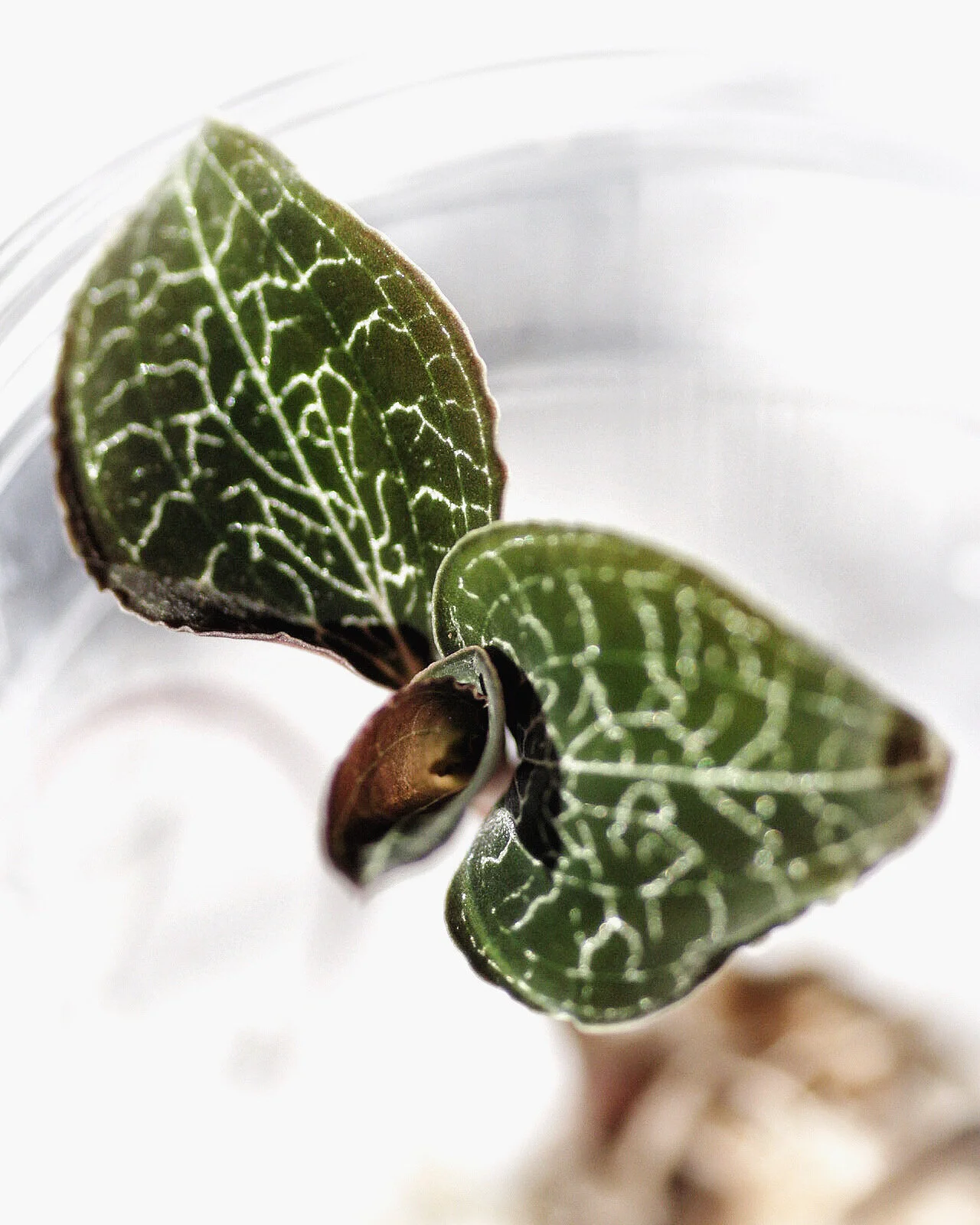 My jewel orchid obsession all started when I happened to see some for sale at Vermeer’s Garden Centre and thought I would give them a try. I ended up picking up a Ludisia discolour and Macodes Sanderiana ‘Frost’. They were both beautiful and mesmerizing to look at. I started reading all that I could about them. I learned that the Ludisia discolour is fairly low maintenance and easy care and does fine even without high humidity — I keep it with other houseplants outside of the terrarium (still near a humidifier). I think it’s happy since it’s currently putting out two new tiny growth points. The Macodes Sanderiana ‘Frost’ on the other hand seems to be slightly more needy in terms of humidity and seems to be a good fit for a terrarium. I just want to talk about the leaves on the ‘Frost’ for a second, they are stunningly beaitiful — They are light green and are accented with lightening like veins that literally glitter gold. Once you see one in person you want to have them all, which is why I ended up getting four more.